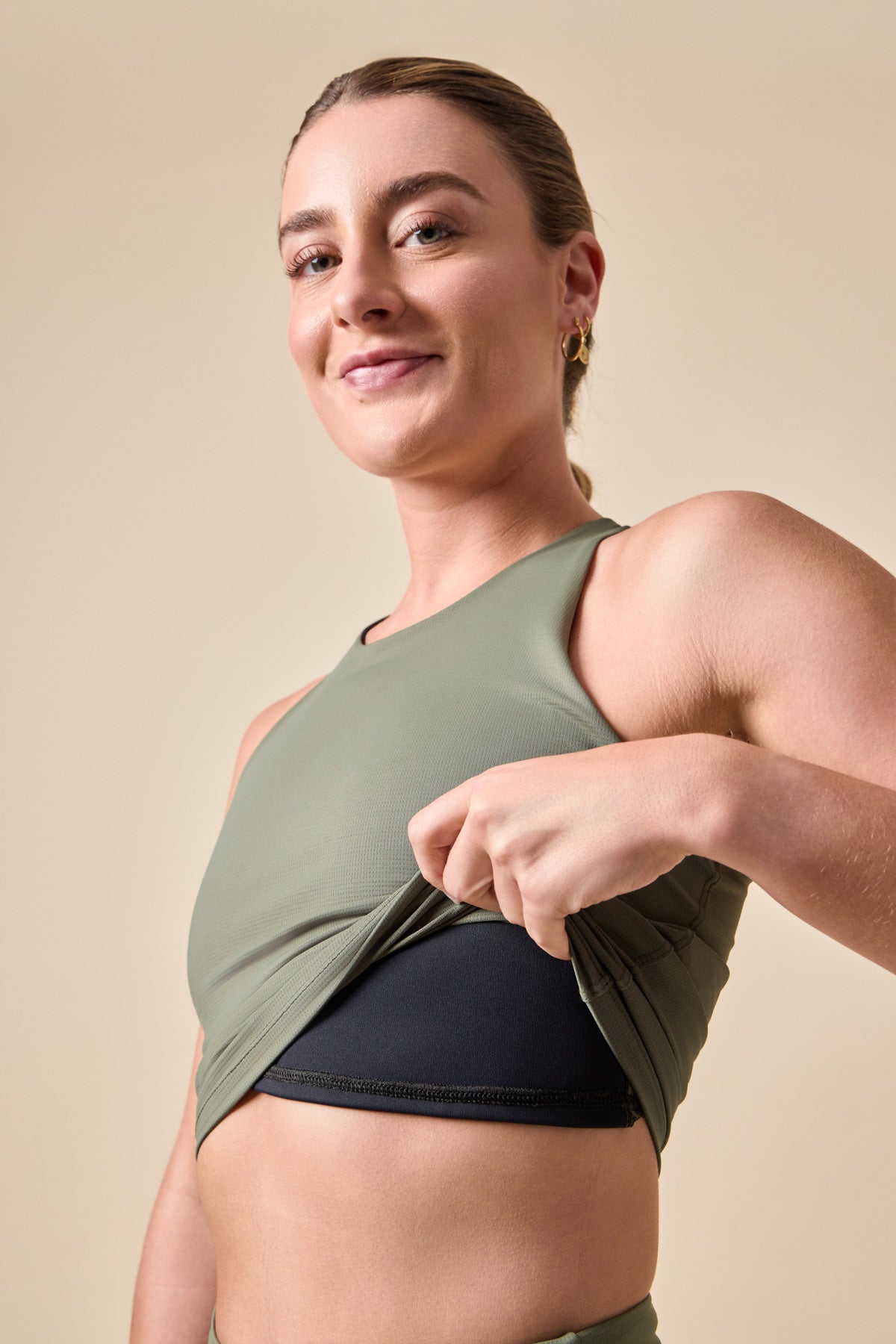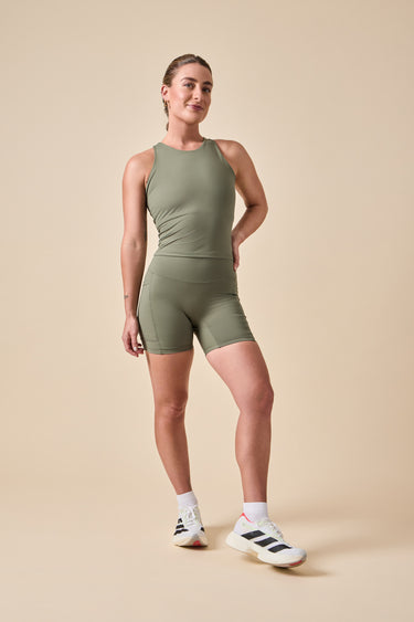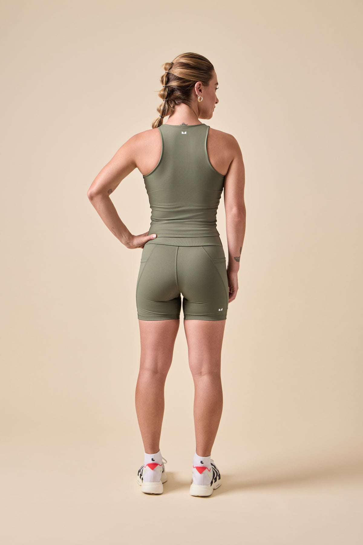 Conjunto bermuda curtinha + top-blusa de compressão oliva